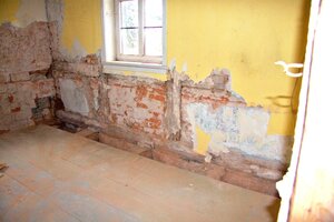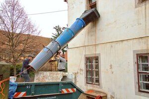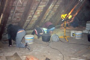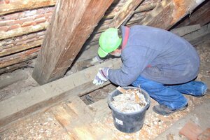 Beim 9. Arbeitseinsatz wurde weiter an der Freilegung der Balkenköpfe gearbeitet. Schwerpunkt war neben Restarbeiten in der 1. Etage das Dachgeschoß. Die Arbeiten wurden unter widrigen Bedingungen durchgeführt und waren sehr anstrengend. Es war eng unter dem Dach und das Ausschaufeln der Verfüllung war eine staubige Angelegenheit.