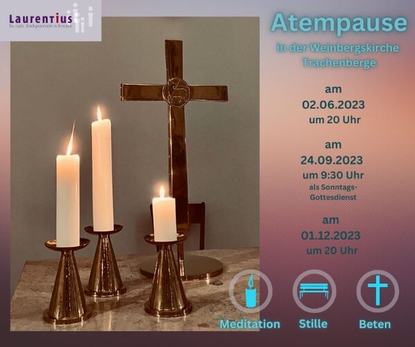 Sie finden einmal pro Quartal, i.d.R. an einem Freitag 20:00 in der Weinbergskirche, Dresden-Trachenberge statt. So ist die ATEMPAUSE wie geschaffen für den Wochenausklang, wenn die Last der Verpflichtungen der Woche abfällt. Dann ist Zeit zur Pause, um Atem zu holen.