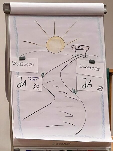 Am Ende Gedankenaustausches wurden wir vom Moderatorenteam aufgefordert, uns mit Ja oder Nein zu einer gemeinsamen Zukunft zu bekennen. Nach getrennter Beratung der Kirchenvorstände wurde das Ergebnis durch Regina Hadem und Florian Reißmann präsentiert. Zweimal JA. Die erforderlichen (gleichlautenden) Beschlüsse werden in den nächsten KV-Sitzungen gefasst und der Bezirkssynode übermittelt.