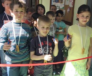 Mittags wurden die letzten Möbel und Kisten vom "alten" Hortzimmer in den Neubau transportiert. Dann standen die Kinder gespannt und voller Freude vor dem roten Band an der Eingangstür. Hier dürfen sie sich nun wie zu Hause fühlen; und deshalb bekam jedes Kind symbolisch ein Schlüsselband überreicht.