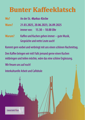 Unter diesem Motto läd die interkulturelle Arbeit der Laurentiuskirchgemeinde und die Cafédrale an folgenden Tagen zum bunten Kaffeeklatsch an die St.-Markus-Kirche ein: