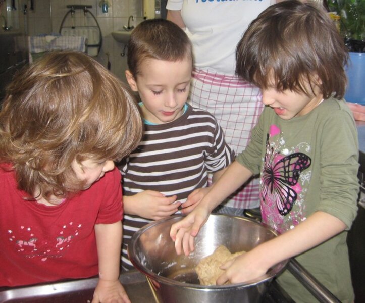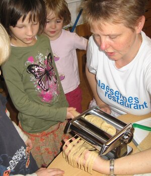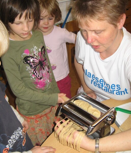 Es ist wieder mal soweit! Nachdem wir schon zweimal eine Suppenwoche hatten, gibt`s jetzt eine Nudelwoche. Wir wollen den Kindern zeigen wir Nudeln selber hergestellt werden. Dazu dürfen jeden Tag einige Kinder einer Gruppe mit uns gemeinsam einen Nudelteig für ihre Gruppe herstellen. Danach drehen wir den Teig durch eine Nudelmaschine und schauen mal, was für Nudeln raus kommen und wie sie schmecken. Alle anderen bekommen herkömmliche Nudeln. Am nächsten Tag ist eine andere Gruppe dran. So Kommen alle Kinder in den Genuss selbstgemachte Nudeln zu essen. Mal sehen, ob wir am Ende alle „genudelt“ sind.