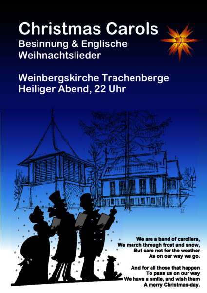 Neben den Christvespern in allen Kirchen unserer Gemeinde erklingen am Heiligen Abend, 22 Uhr, in der Weinbergskirche Trachenberge englische Weihnachtslieder. Texte werden projiziert, so dass alle Zuhörerinnen und Zuhörer zum Mitsingen eingeladen sind. Genießen Sie die Atmosphäre zu später Stunde - im Anschluss können Sie bei Glühwein und Punsch die Christnacht genießen.