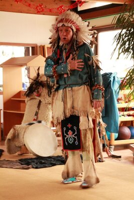 Nach einem erlebnisreichen Vormittag versammelten wir uns zum Abschluss wieder gemeinsam im Saal. Für große Augen sorgte dabei der Besuch eines „echten“ Indianers. Dieser berichtete uns aus dem Leben der Indianer, zeigte uns deren Tänze und lernte uns den „Friedensgruß“ – mit welchem wir uns schließlich wieder voneinander verabschiedeten.