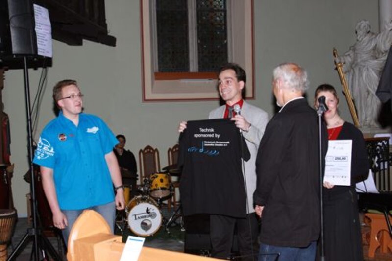 Die Techniker erhielten gleichzeitig T-Shirts, die auf die Unterstützung durch den Förderkreis Kirchenmusik Laurentius Dresden e.V. aufmerksam machen.