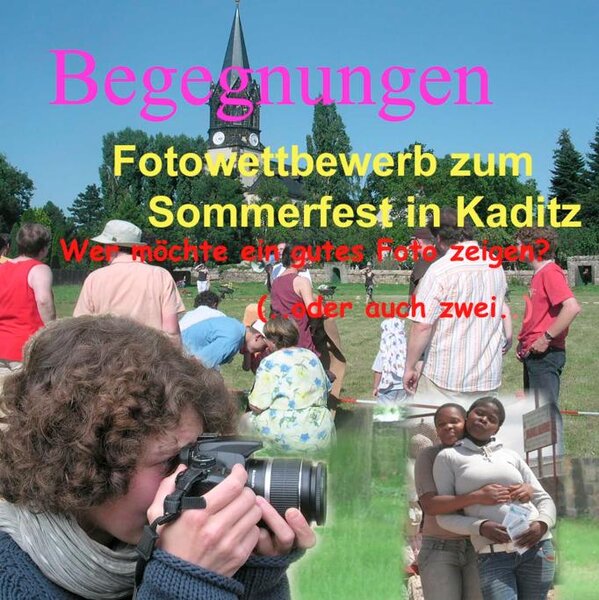 Das Thema kann frei ausgelegt werden, dass darunter z.B. Begegnungen zwischen Menschen in der Gemeinde, zum Kirchentag, im Urlaub, oder wo auch immer, verstanden werden. Die Fotos werden zum Sommergemeindefest am 3. September 2011 in Kaditz ausgestellt, und hier findet auch die Wahl der besten Fotos statt. Alle Anwesenden können sich daran beteiligen.