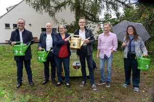 auf dem Foto von rechts nach links: Davida Becker (Pfadfinderstamm Trachenschlucht), Tom Umbreit (Umweltzentrum Dresden), Dr. Peter Skyba (Gießkannenheld:innen Dresden), Eva Jähnigen (Umweltbürgermeisterin LH Dresden), Ralf Strothteicher (Stadtentwässerung Dresden), Dr. Florian Reißmann (Kirchenvorstand). Foto: Torsten Fiedler, Stadtentwässerung Dresden