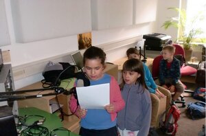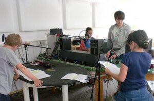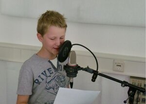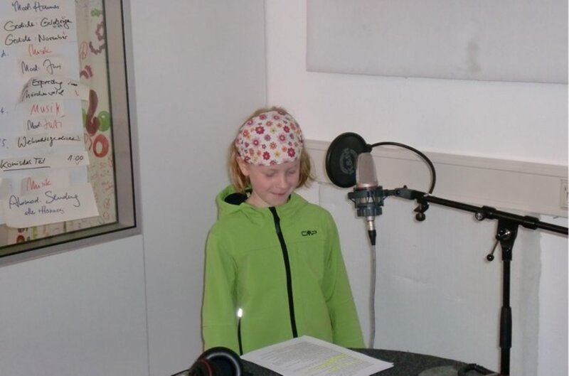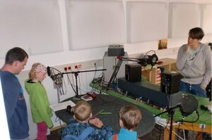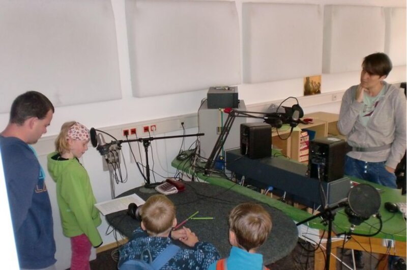 Am 22.08. – dem Freitag in der vorletzten Woche der Sommerferien 2014 – hatten wir uns etwas ganz besonderes vorgenommen. Wir fuhren zum freien Radio auf die Jordanstraße in der Dresdner Neustadt und begannen damit, ein Hörspiel aufzunehmen. Wir entschieden uns für Friedrichs Geschichte „Der Sektfall“, welche im vergangenen Schuljahr in der AG „Kreatives Schreiben“ entstanden war. Vor Ort betreute uns die Medienpädagogin Antje Meichsner vom Sender Coloradio. Von ihr bekamen wir eine basale Einführung in die Mikrofonie und in die Geräuschproduktion. Außerdem führte sie uns Audioschnittverfahren und die Kombination Geräusch – gesprochenes Wort vor. Und so sprachen wir den Hörspieltext ein und produzierten die dazu passenden Geräusche. Nach zwei Stunden intensiven Schaffens war es bereits Zeit, den Rückweg ins Kinderhaus anzutreten.