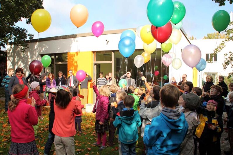 Zum Schluss wurden einige Personen geehrt, die den Hortanbau überhaupt ermöglichten und zu guter letzt ließen wir eine Vielzahl von Luftballons mit dem Absender des Kinderhauses an der Apostelkirche in die Höhe steigen.
