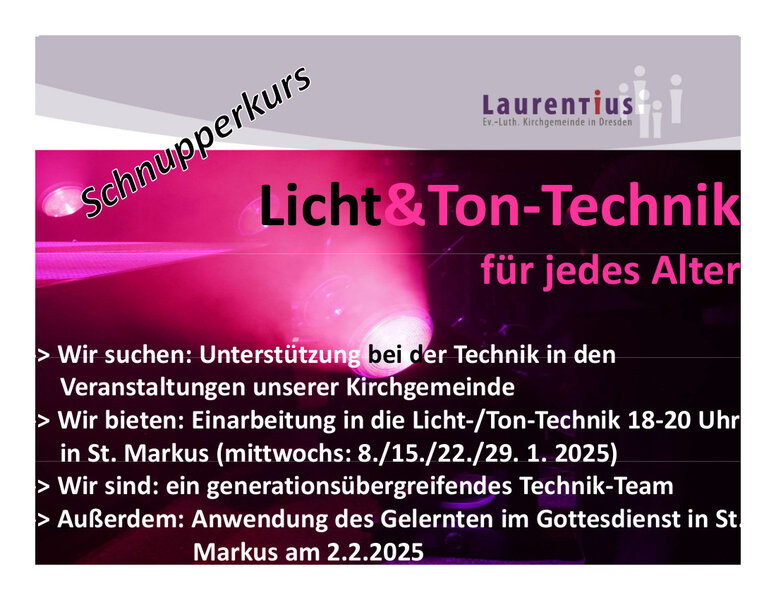 Wir bieten: Einarbeitung in die Licht-/Ton-Technik 18-20 Uhr in St. Markus (mittwochs: 08.01./15.01./22.01./29.01.2025)