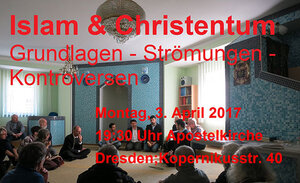 Am Montag, den 03.04.2017 findet in der Apostelkirche Dresden ein Gemeindeabend mit Vortrag mit Diskussion mit Dr. Lamprecht, Beauftragtem für Weltanschauungsfragen der Landeskirche Sachsen, statt.