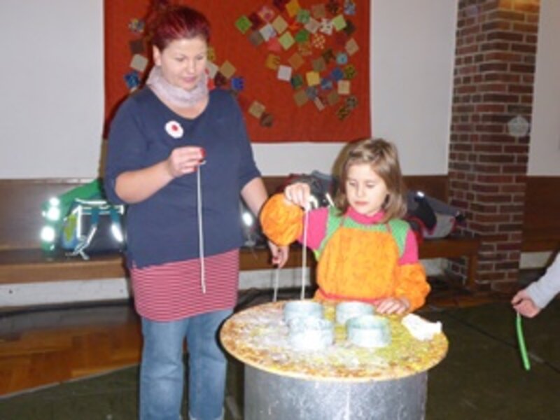 Beim Kerzenziehen wird ein Docht nacheinander in flüssigen Wachs verschiedener Farben getaucht, so dass wunderschöne mehrschichtige Kerzen entstehen. Mara Studen und Sarah Wagner, beide Sozialpädagogen der Laurentiuskirchgemeinde, geben den Kindern Hilfestellung. Die fertigen Kerzen werden gewogen. Daraus ergibt sich der Materialpreis für die Besucher. Mara Studen erlangte ihre Kenntnisse bei einem Workshop in Zürich. Mittlerweile besitzt die Offene Jugend der Laurentiuskirchgemeinde eine komplett ausgerüstete Kerzenzieherei, die aus fünf voneinander unabhängigen Geräten besteht.