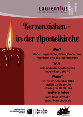 Auch in diesem Jahr laden wir Sie und euch wieder zum Kerzenziehen in den Saal der Apostelkirche ein. Ob jung oder alt, groß oder klein, neue Leute oder alte Hasen: alle sind willkommen einzigartige, schöne Kerzen bei uns zu ziehen. Vorkenntnisse sind nicht erforderlich.