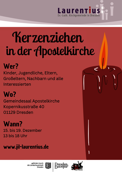 Auch in diesem Jahr dampfen im Saal der Apostelkirche wieder die Wachstöpfe. Alle Interessierten sind herzlich eingeladen eigene Kerzen herzustellen. Besondere Kenntnisse sind dafür nicht erforderlich, Spaß ist aber garantiert!