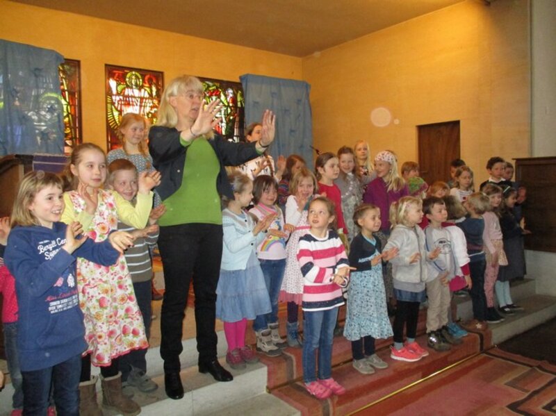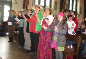 Die Kurrendekinder hatten mit unserer Kirchenmusikerin Gisela Semper ein philippinisches Kinderlied gelernt. Und Mango, Kiwi und Ananas kann man nicht nur essen, sondern auch davon singen und tanzen. Die musikalische Begleitung hatten wieder Eltern übernommen, die von Gisela Semper unterstützt wurden.