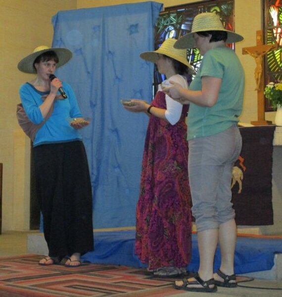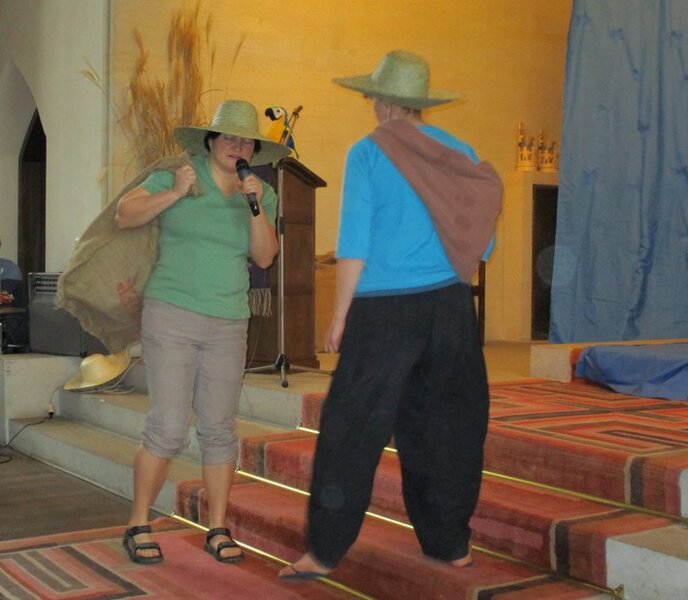 In Spielszenen sahen wir das Gleichnis von den Arbeitern im Weinberg. Nur waren es diesmal die Arbeiter auf dem Reisfeld, die am Abend jeder eine Schüssel Reis bekamen. Und diese Arbeiter waren Kinder.