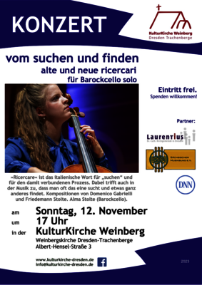 Die »ricercari« des in Bologna wirkenden Domenico Gabrielli zählen zu den ersten Kompositionen für Violoncello solo überhaupt und sind in ihrer Machart so rätselhaft wie bemerkenswert. Sie gehören daher zu den Favoriten der jungen Cellistin Alma Stolte. Auch für Friedemann Stolte waren die »ricercari« inspirierende Fundstücke, in denen er heutige Vorgänge und Themen fand und die ihn zu neuen ricercari anregten: über Recycling-Prozesse, über Demenz und über den tipping point. Wie diese Themen in die Stücke gekommen sind, was Zuhörer in ihnen vielleicht noch alles finden können und wie man alte und neue Stücke auf dem Barockcello spielt, darüber wollen wir gemeinsam mit Tochter und Vater Alma und Friedemann Stolte in diesem Gesprächskonzert in fragenden und hörenden Austausch kommen.