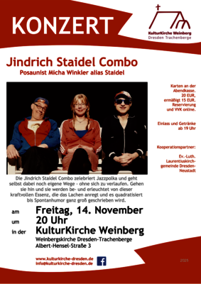 Die Jindrich Staidel Combo – das sind Musiker und eine *Innen , die (manchmal außen) eine musikalisch kulturelle Reise ins Hinterland der Fantasie zu den Quellen der Jazzpolka unternehmen. Dabei kommt es zu einem Feuerwerk der Jazzpolka, wo Raum auf Zeit trifft, und bei dem Pro Haska, ein Tscheche gefangen im Körper eines Deutschen, mit ein- und leitenden Worten in Brocken German durchs Programm führt. Erleben Sie einen Abend, der die dunkle Seite unseres Alltags mehr als nur aufhellt und wie immer in Farbe ausgestrahlt wird.