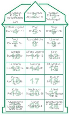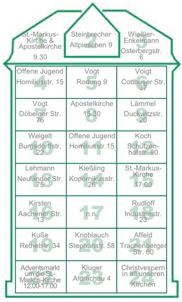 Jeden Tag ein Türchen – welche Überraschung sich wohl dahinter verbirgt? Wir wollen zum fünften Mal einen „begehbaren“ Adventskalender in unserer Gemeinde gestalten. So erleben wir uns als Gemeinde, treffen Bekannte und Fremde, Kinder und Senioren, Singles und Familien und machen uns gemeinsam auf den Weg zur Krippe.