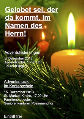 Auch in diesem Jahr finden in der Ev.-Luth. Laurentiuskirchgemeinde traditionelle Adventsmusiken unter dem Motto "Gelobet sei, der da kommt im Namen des Herrn" statt: