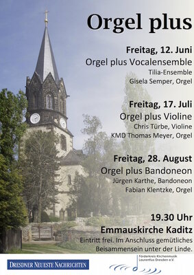 Am Freitag, dem 17. Juli 2015 wird um 19.30 Uhr die die beliebte Sommerkonzertreihe „Orgel plus“ wird mit Werken von Johann Sebastian Bach, Felix Mendelssohn Bartholdy und Josef Rheinberger fortgesetzt. Zu Gast sind Chris Törpe aus Zwickau (Violine) und KMD Thomas Meyer aus Pirna (Orgel). Der Eintritt ist frei.