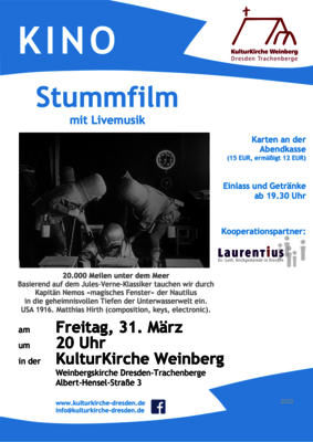 Basierend auf dem Jules-Verne-Klassiker tauchen wir durch Kapitän Nemos »magisches Fenster« der Nautilus in die geheimnisvollen Tiefen der Unterwasserwelt ein. Livemusik von Matthias Hirth aus Leipzig (composition, keys, electronic).