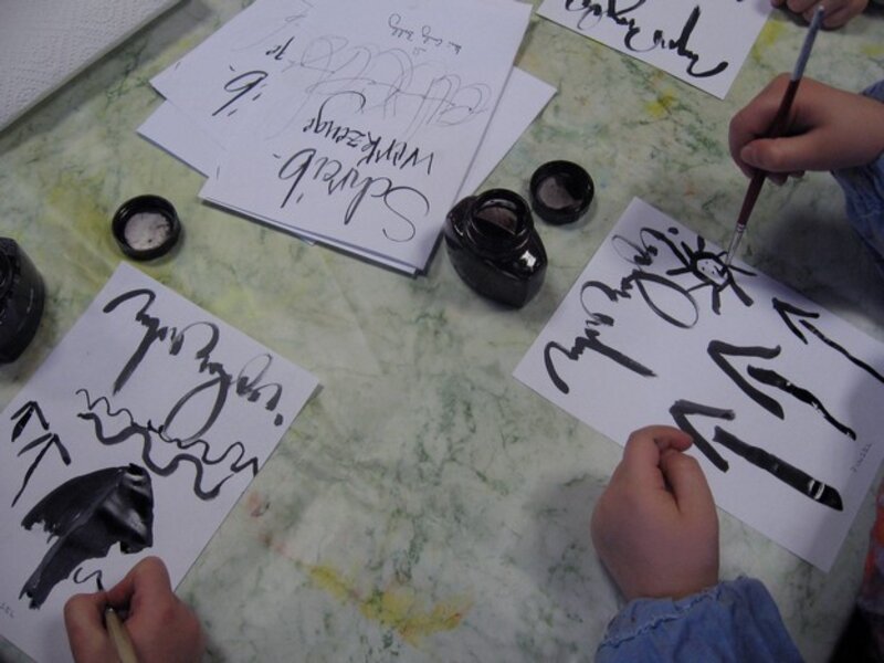 Ein "Dauerprojekt" ist die Vorschule. Meistens treffen sich die Vorschulkinder aus allen Gruppen einmal pro Woche und bereiten sich spielerisch und voller Tatendrang auf die große Veränderung nach der Kindergartenzeit vor. Dazu gehört ebenso der Besuch der Bibliothek wie verschiede Projekte - hier das Kennenlernen und Ausprobieren von alten Schreibgeräten.