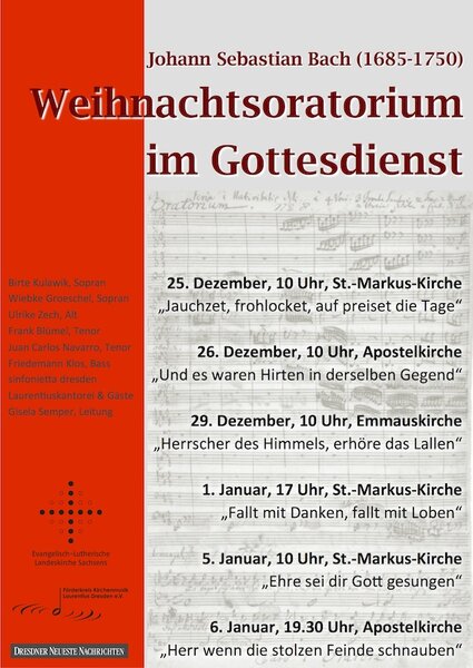 Die Aufführung des Weihnachtsoratoriums von Johann Sebastian Bach in sechs Gottesdiensten in den Kirchen* der Ev.-Luth. Laurentiuskirchgemeinde Dresden-Trachau wurde durch herausragendes Engagement sehr vieler verschiedener Personen ermöglicht. Herzlichen Dank dafür!