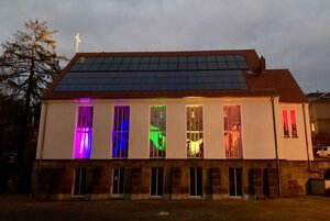 Seit heute erstrahlen die Fenster der Weinbergskirche wieder in den Farben des Regenbogens. In der Bibel gilt der Regenbogen als Zeichen des Bundes zwischen Gott und den Menschen. So gibt dieser nach der großen Sintflut den Überlebenden ein Zeichen seiner Treue und der Versöhnung mit seinen Geschöpfen für alle Zeiten.